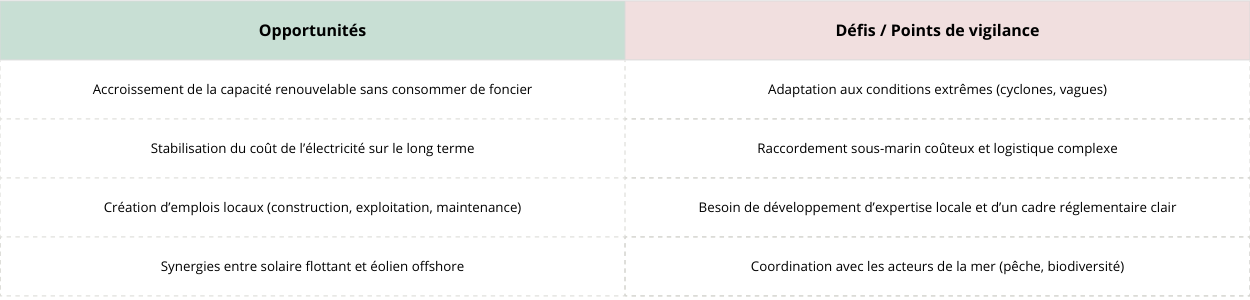 Le solaire flottant est une voie prometteuse, mais il reste à adapter la technologie aux conditions cycloniques, aux contraintes marines tropicales, et au coût des raccordements à un réseau insulaire.