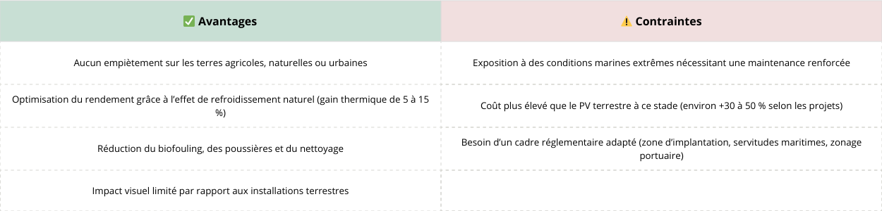 - Positionnements industriels : plusieurs acteurs français ou européens (Ciel & Terre, SolarinBlue, HelioRec, Ocean Sun…) développent des solutions spécifiques pour le solaire offshore, avec des premiers démonstrateurs testés ou en cours de montage.